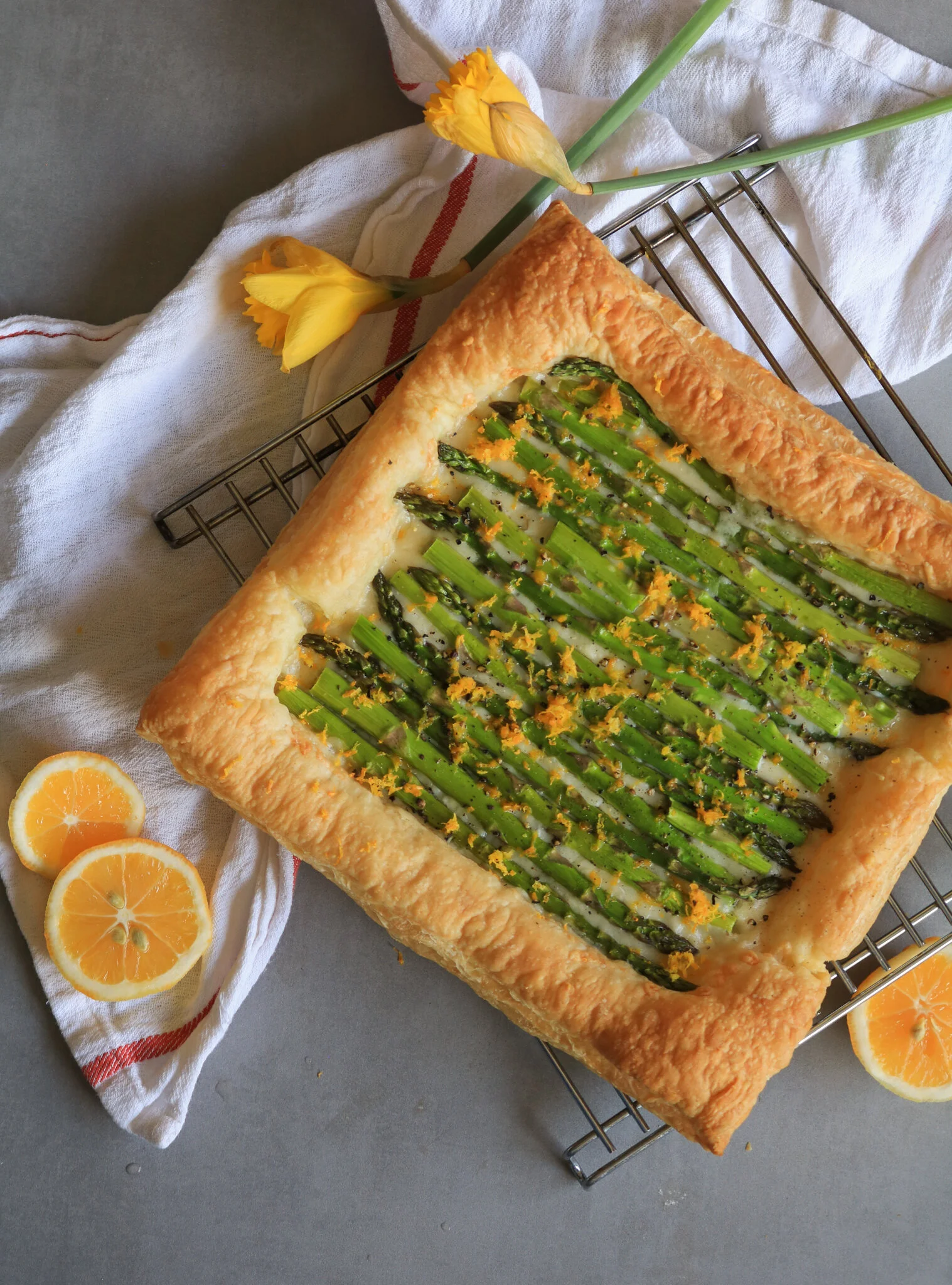 When the pastry is defrosted, roll dough into an 8x8 square. Pile the cheese in the center of the square and evenly spread into a smaller square, leaving about 1.5 inches of pastry around the sides. Trip the asparagus to the length of the cheese. Lie the asparagus on top of the cheese, alternating tip to end (See photo)